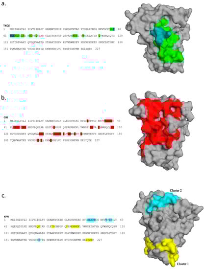 The predicted cluster of motif TKQE involves the residues of linear sequence TKQE, which are located on a very exposed stretch of the structure (Figure 7a). The predicted cluster of the motif GKI appears to cover a relatively large stretch of the structure and should thus be interpreted with consideration (Figure 7b). The discontinued cluster of the KPN motif does not include the linear sequence KPN that is present in the primary sequence (Figure 7c, yellow). Thus, we also graphically present the second-best cluster, which involved the KPN residues (Figure 7c, turquoise).