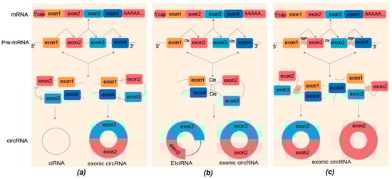 CircRNAs are generated by a “back-splicing” process. The biogenesis of circRNAs reportedly involves several mechanisms, such as reverse splicing, cis-regulatory elements, and RNA-binding protein (RBP)-driven circularization [,]. Most circRNAs in eukaryotes are transcribed from pre-mRNAs []. They can arise from different genomic regions, such as exons (exonic circRNAs), introns (intronic circRNAs, ciRNA), and exon–intron (exon–intron circRNAs, EIciRNA) [,]. The spliceosomes join the downstream 5′ and upstream 3′ splicing sites through back-splicing (Figure 1a). A single gene can produce multiple circRNAs with different lengths and sequences by alternative back-splicing, but these circRNAs share the same back-splicing site []. In addition, multiple RNA pairs in introns can compete with each other for alternate cyclization to form different circRNAs. For example, DNMT3B and XPO1 can generate multiple circular exons by alternate circularization []. Back-splicing combined with transcription could increase the biogenesis of circRNAs by inhibiting the co-transcription 3′ terminal processing [,,]. Back-splicing can compete with linear RNA splicing by direct reverse splicing and nesting intermediates to produce a mature circRNA [,,,].