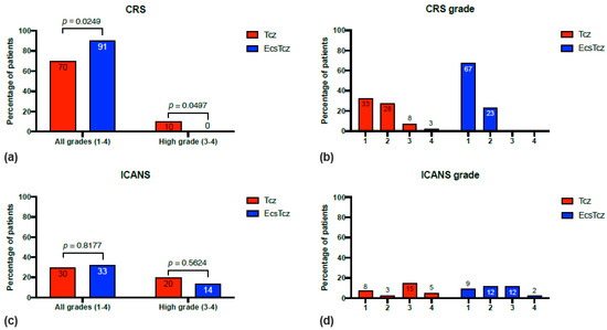 Comparison of adverse events from CAR T-cell therapy in cohorts Tcz vs. EcsTcz. (a) Comparison of CRS incidence. (b) Visualization of CRS grade distribution. (c) Comparison of ICANS incidence. (d) Visualization of ICANS grade distribution.