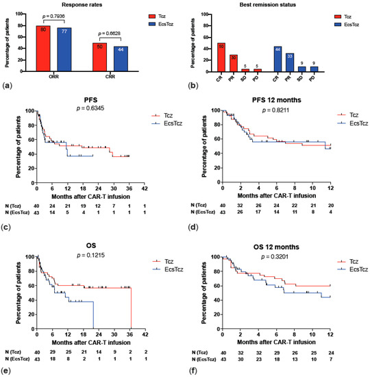 Comparison of outcomes of CAR T-cell therapy in cohorts Tcz vs. EcsTcz. (a) Comparison of overall response rates (ORRs) and complete remission rates (CRRs). (b) Distribution of best remission status. (c) Progression-free survival (PFS). (d) Progression-free survival in the first 12 months. (e) Overall survival. (f) Overall survival in the first 12 months.
