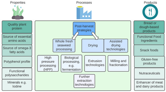 This review paper is divided into three sections: (i) seaweed properties (why is seaweed consumed), (ii) seaweed processes (how is seaweed transformed from plant to plate), and (iii) seaweed products (how is seaweed consumed). Section one includes the nutritional profile of seaweed with a focus on iodine and its impact on the final products. The second section includes different methods of processing with novel applications in the context of seaweed. Lastly, section three discusses a range of seaweed products on the market and in development. As a narrative review, this paper has compiled a comprehensive, critical, and objective analysis of the topic of seaweed aquaculture, through an extensive review of the available literature. The aim of this narrative review is to provide relevant and timely information on the above areas of novel food product development for food producers facing pressure in this area. The topics covered in this review will provide the reader with a full picture of the state-of-the-art of the seaweed aquaculture industry. Figure 1, below shows an overview of seaweed aquaculture and some of the topics discussed in this review paper.