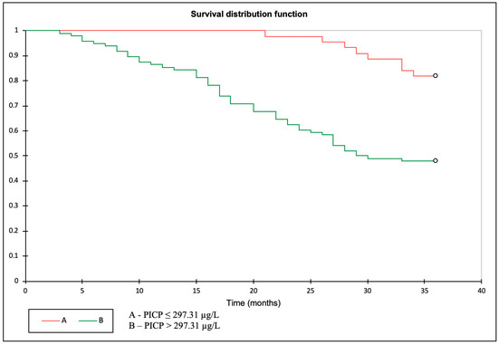 The cut-off point for PICP as a predictor of mortality was established using the ROC curve, at 297.31 µg/L. After dividing the study sample into two groups according to this cut-off, Kaplan–Meier analysis showed that all-cause mortality was significantly higher in patients with PICP > 297.31 µg/L (HR 5.071; 95% CI 1.935–13.29; p = 0.001; log rank < 0.0001) (Figure 1).