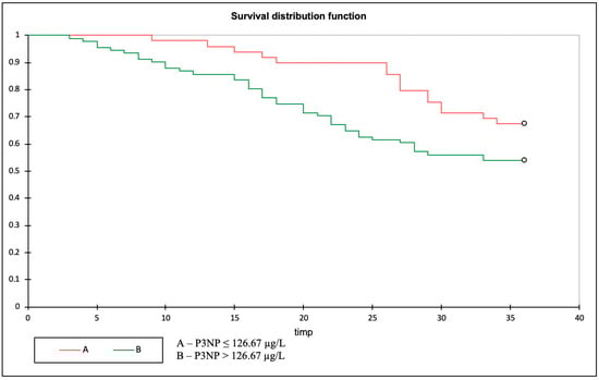 The cut-off point for P3NP as a predictor of mortality was established using the ROC curve, at 126.67 µg/L. After dividing the study sample into two groups according to this cut-off, Kaplan–Meier analysis showed that all-cause mortality was significantly higher in patients with P3NP > 126.67 µg/L (HR 2.089; 95% CI 1.044–4.178; p = 0.03; log rank = 0.05) (Figure 2).
