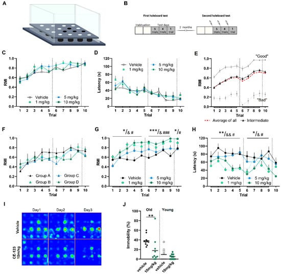 (A) Schematic of the hole-board maze, a non-sophisticated paradigm for the evaluation of reward-motivated spatial learning and memory. (B) A cartoon depicting the timeline of experiments. (C,D) Performance of young rats (5 months) treated with S-CE-123 at 1, 5 and 10 mg/kg body weight or vehicle in hole-board task. There were no significant differences in (C) RMIs (F3,36 = 0.4642, p = 0.7090, two-way RM-ANOVA) or (D) latency (F3,36 = 0.1431, p = 0.9335, two-way RM-ANOVA) between four groups (n = 10/group). (E) A large cohort of 22–24 months old rats (n = 160) [34] was behaviorally characterized using a hole-board test and based on their mean RMIs derived from trial 6 and 10, rats were characterized as impaired, unimpaired or “intermediate”. Thirty-eight “intermediate” rats of age 22–23 months were selected, randomly grouped and used for treatment. (F) Four groups of aged rats were equal in terms of RMIs in the first hole-board test. (G–I) Performance of old (24–25 months) rats treated with S-CE-123 at 1, 5 and 10 mg/kg body weight or vehicle in hole-board task (n = 9–10/group). There was a significant treatment effect with improved (G) RMIs (day1 (F3,34 = 4.050, p = 0.0145, two-way RM-ANOVA), day2 (F3,34 = 8.021, p = 0.0004, two-way RM-ANOVA); day3 (F3,34 = 3.273, p = 0.0328, one-way ANOVA) and decreased (H) latency (day1 (F3,34 = 5.405, p = 0.0038, two-way RM-ANOVA), day2 (F3,34 = 3.698, p = 0.0209, two-way RM-ANOVA); day3 (F3,34 = 2.281, p = 0.0969, one-way ANOVA) in S-CE-123 groups. * ANOVA general treatment effect, multiple comparison, & vehicle vs. 1 mg/kg and # vehicle vs. 10 mg/kg. (I) Heat map of hole visits of aged rats. (J) In the first trial on day1, aged S-CE-123-treated animals spent significantly less time immobile compared to vehicle treated rats (p = 0.0038, Mann–Whitney test), whereas, in young animals, treatment had no effect on immobility (p = 0.4988, Mann–Whitney test). Values are expressed as mean ± SEM, (*/&/# p < 0.05; **/&& p < 0.01; ***/### p < 0.001).