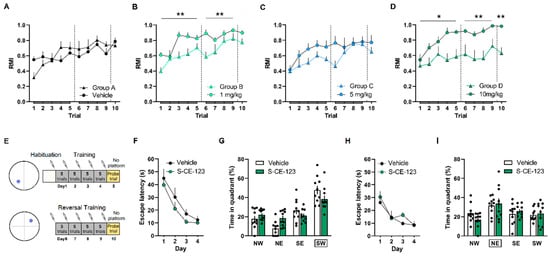 Analyses of hole-board RMIs in the first test (no treatment) compared to the second test (treatment) for (A) vehicle group (day1 (F1,9 = 0.1125, p = 0.7450, 2-way RM-ANOVA); day2 (F1,9 = 1.075, p = 0.3270, 2-way RM-ANOVA); day3 (p = 0.3925, paired t-test)) and for S-CE-123 groups at (B) 1 mg/kg (day1 (F1,8 = 12.38, p = 0.0079, 2-way RM-ANOVA); day2 (F1,8 = 11.93, p = 0.0086, 2-way RM-ANOVA); day3 (p = 0.0322, paired t-test)), (C) 5 mg/kg (day1 (F1,8 = 3.386, p = 0.1030, 2-way RM-ANOVA); day2 (F1,8 = 2.448, p = 0.1563, 2-way RM-ANOVA); day3 (p = 0.2071, paired t-test)) and (D) 10 mg/kg (day1 (F1,9 = 30.62, p = 0.0004, 2-way RM-ANOVA); day2 (F1,9 = 9.210, p = 0.0141, 2-way RM-ANOVA); day3 (p = 0.0024, paired t-test)). (E–I) Different sample of old rats (21–22 months) were tested in a MWM spatial memory task. (E) Schematic demonstration of experimental design and treatment. There was no significant difference between vehicle and 10 mg/kg S-CE-123 in (F) escape latency during four days of training, in (G) time spent in target quadrant during probe trial, (H) in escape latency during four days of training in reversal learning and in (I) time in target quadrant during probe trial of reversal test. Values are expressed as mean ± SEM (n = 10; * p < 0.05; ** p < 0.01).
