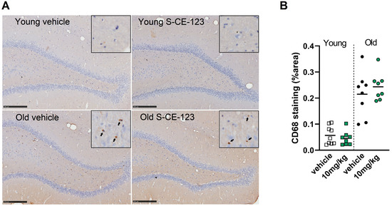 As spatial learning and memory tasks heavily depend on hippocampal function, we focused our further histological analyses on this region. As an indicator of neuroinflammation, we analyzed the number of CD68-positive cells. Although there is some CD68 expression in resting microglia [35], CD68 is associated with the phagosomal/lysosomal pathway of microglia and is therefore considered a marker of activated microglia [36,37]. Elevation of the CD68 was also repeatedly reported in aged subjects [38]. Moreover, it has been suggested that CD68 could play a role associated with cognitive decline in a subgroup of the normally aged population [39]. Aged rats had a significantly higher number of CD68-positive cells (Figure 5A,B) compared to the young animals, suggesting altered phagosomal/lysosomal processing of microglia in the old. Acute treatment with S-CE-123 had no effect on the number of CD68-positive cells in aged and young animals in the hippocampus (unpaired t-test, p > 0.05, n = 8–9/group).