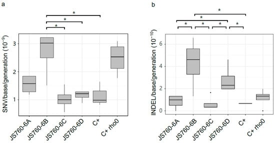 Mutation rates among the six strains. (a) SNV rate. (b) INDEL rate. The “*” symbols in the panels a and b indicate statistical significance with t test p < 0.05. The genotypes of the six strains are as follows: JS760-6A (MRPL25+ atp3G348T), JS760-6B (mrpl25Δ ATP3+), JS760-6C (MRPL25+ ATP3+), JS760-6D (mrpl25Δ atp3G348T), C+ (positive control), C+ rho0 (negative control).