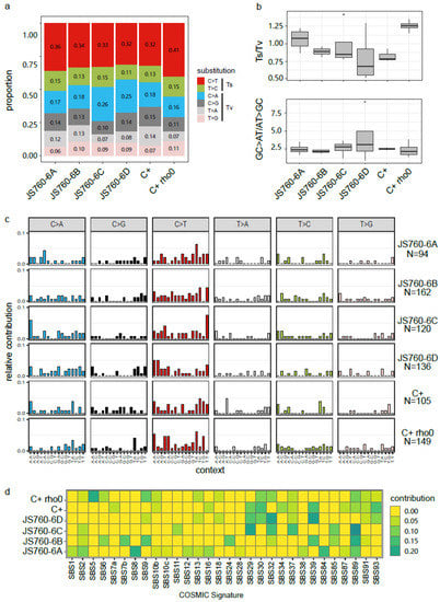 Mutation spectra comparison among the six strains. (a) Proportion of six types of substitutions. (b) Transition/Transversion ratio and G/C to A/T substitution bias. (c) SNV profiles within a trinucleotide context. The number of SNVs used for the analysis are 94, 162, 120, 136, 105, and 149 for JS760-6A, 6B, 6C, 6D, C+, and C+ rho, respectively. (d) The SNV profiles were fit to the COSMIC signature (https://cancer.sanger.ac.uk/cosmic/signatures, accessed on 13 December 2022) and the relative contributions of SBS (single base substitution) signatures are shown. The genotypes of the six strains are as follows: JS760-6A (MRPL25+ atp3G348T), JS760-6B (mrpl25Δ ATP3+), JS760-6C (MRPL25+ ATP3+), JS760-6D (mrpl25Δ atp3G348T), C+ (positive control), C+ rho0 (negative control).
