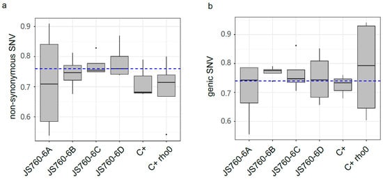 Non-synonymous and genic SNVs of the six strains. (a) Proportion of non-synonymous SNVs. (b) Proportion of genic SNVs. The blue lines in panels a and b represent the expected values for the proportion of non-synonymous SNVs and genic SNVs, respectively, under the neutral evolution model. The genotypes of the six strains are as follows: JS760-6A (MRPL25+ atp3G348T), JS760-6B (mrpl25Δ ATP3+), JS760-6C (MRPL25+ ATP3+), JS760-6D (mrpl25Δ atp3G348T), C+ (positive control), C+ rho0 (negative control).