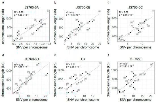 The number of SNVs positively correlates with chromosome lengths. The panels (a–f) show strong linear correlation between the number of SNVs identified on each chromosome for each strain (x-axis) and chromosome length (y-axis). The genotypes of the six strains are as below: JS760-6A (MRPL25+ atp3G348T), JS760-6B (mrpl25Δ ATP3+), JS760-6C (MRPL25+ ATP3+), JS760-6D (mrpl25Δ atp3G348T), C+ (positive control), C+ rho0 (negative control).