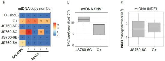The copy number change and mutations of the mitochondrial genome. (a) The mitochondrial copy numbers of the six ancestor strains and their four MAL replicates. (b) The mitochondrial SNV rate. (c) The mitochondrial INDEL rate. The genotypes of the six strains are as follows: JS760-6A (MRPL25+ atp3G348T), JS760-6B (mrpl25Δ ATP3+), JS760-6C (MRPL25+ ATP3+), JS760-6D (mrpl25Δ atp3G348T), C+ (positive control), C+ rho0 (negative control).