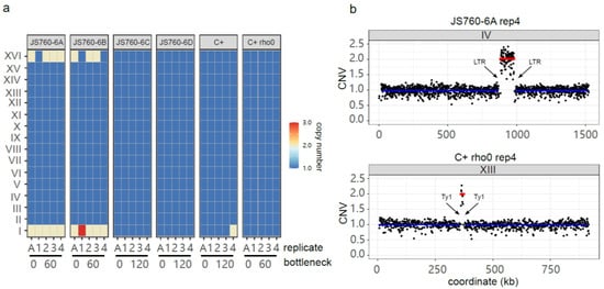 In addition to SNVs and INDELs, we also analyzed whole-chromosome (i.e., aneuploidy) and segmental copy number variants (CNVs) across all the MALs. We found the chromosome I (chrI) and XVI (chrXVI) aneuploidies existed in the JS760-6A (MRPL25+ atp3G348T) and JS760-6B (mrpl25Δ ATP3+) ancestor strains (Figure 6a). This was unknown when we started the mutation accumulation experiment and was likely introduced during strain construction but before spore dissection given the 2:2 segregation ratios among JS760-6A, JS760-6B, JS760-6C, and JS760-6D. These aneuploidies may respond to MRPL25 deletion and the subsequent mitochondrial dysfunction, given it is known that aneuploidy can act as a transient or stable stage for survival or adaptation when cells are under stress [,,,,,]. During mutation accumulation, the chrI aneuploidy was kept to the end time point in all eight MALs, while the chrXVI aneuploidy was lost in three out of eight MALs. We also noticed that one JS760-6B MAL acquired two additional copies of chrI (a total of three copies of chrI) and one C+ MAL gained an extra copy of chrI. Aneuploidy has been reported to influence mutation rates []. In our system, we found that chrI and chrXVI aneuploidies do not affect our conclusion of the impact of mrpl25Δ on SNV and INDEL rates because both JS760-6A (MRPL25+ atp3G348T) and JS760-6B (mrpl25Δ ATP3+) were chrI and chrXVI aneuploidies, but they showed distinct SNV and INDEL rates, indicating that aneuploidy was not the primary driver for genome instability. Moreover, the rho0 strain was euploid and showed a SNV rate as high as the JS760-6B strain (mrpl25Δ ATP3+), suggesting mitochondrial dysfunction should have much larger effects on genome instability than aneuploidy. In addition to aneuploidy, we also analyzed segmental CNVs. Two such cases with convincing signals were presented (Figure 6b). The break points of both cases occurred in repeat regions such as long-terminal repeats (LTRs) and full-length Ty1 retrotransposable elements, which is consistent with a previous report on the strong association of genome rearrangement breakpoints and repetitive sequences in yeast genomes [].