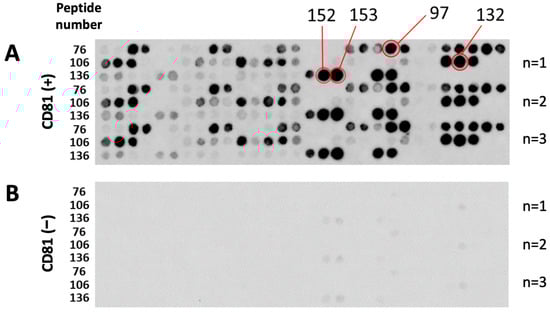 Fluorescent images of EWI-2 peptide array after binding assay with Alexa Fluor® 488−labeled CD81 protein. (A) EWI-2 peptide array bound to Alexa Fluor® 488−labeled CD81 protein (CD81 (+)). (B) EWI-2 peptide array bound to Alexa Fluor® 488 dye (CD81 (−), blank). The red circles indicate CD81−BP candidate spots.