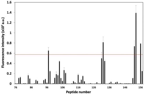 Blank subtracted fluorescence intensity profile of each peptide after binding assay with Alexa Fluor® 488−labeled CD81 protein. Error bars show SD (n = 3). The red line indicates AVG + 2SD. Peptide numbers 76 to 153 were EWI-2−derived peptides. Peptide numbers 154 to 157 were control peptides, AAAA, DDDD, RRRR and KKKK, respectively.