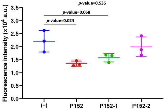 The impact of all CD81-BP candidates on cancer cell migration through the porous membrane was last observed in the Boyden chamber assay. Herein, the MDA-MB-231 cell line was used because this is a triple-negative human breast cancer cell line, with a more aggressive and metastatic behavior compared to other breast cancer cell lines, and shows the high expression of CD81 []. MDA-MB-231 cancer cells were incubated with a candidate CD81-BP (100 nM) in serum-free medium before applying them to the upper chamber. The peptide concentration of 100 nM was chosen because a CD9-targeting peptide, screened from EWI-2 in our previous study, could significantly inhibit cancer cell migration in this condition []. A normal FBS-containing medium was placed in the lower chamber. The cells were allowed to migrate through a porous membrane for 24 h, before the cells that migrated to the opposite side of the membrane were collected, lysed, and quantified by a fluorescent detection method. Figure 4 shows the fluorescence intensity quantified from the migrated cells. Compared to non-treatment (−), P132, P152, and P153 could significantly reduce the migration of MDA-MB-231 cells, while no distinct inhibition was observed in P97 under this condition (Figure 4). Possibly, it was due to the relatively high KD of P97 that caused no inhibitory effect at the concentration of 100 nM (Figure 4). Surprisingly, the inhibitory abilities of P132, P152, and P153 were comparable or competitive to an anti-CD81 monoclonal human antibody (5A6) []. In particular, P152 had the highest potency to suppress MDA-MB-231 cell migration (Figure 4). P132, previously described as a CD9-binding peptide [,], also showed anti-migration activity against MDA-MB-231 cancer cells because of the high expression of CD9 in this cell line. Nevertheless, the best CD81-BP candidate or P152 was more effective in inhibiting MDA-MB-231-cell migration than P132 (Figure 4), possibly due to the higher association of EWI-2 to CD81 than CD9 []. Furthermore, compared to its two scrambled peptides (P152-1 (FRKCKMRL) and P152-2 (KKRCRFLM)), only P152 origin showed statistical significance (p-value < 0.05) in the anti-migration activity (Figure 5, Figures S10 and S11). The scrambled P152-1 showed the impact on MDA-MB-23 cell migration as seemingly as the original P152, possibly because both contained the RL nest, a phosphate- and carboxylate-binding site that presented in the functionally important region of EWI-2 protein (Figure 5) [,]. As anti-human CD81 antibody (5A6) was previously reported to reduce tumor growth and metastasis in vivo by inhibiting cancer cell migration and invasion [], P152, with comparable anti-migratory ability to 5A6, would be one of the promising biomolecules for cancer therapy. According to our previously screened CD9-binding peptides, the observation by high-resolution confocal microscopy suggested that the peptides directly bound to CD9 expressed on the cell surface []. Thus, we hypothesize that P152 in this study has the same potential to directly bind to CD81 expressed on the cell surface and then inhibit cancer cell migration. Due to the limited data here, the affinity, specificity, and inhibitory activity of P152 should be extensively studied by various investigations, such as co-immunoprecipitation, flow cytometry, and confocal microscopy assays, in the future. Further P152-based modification and functionalization, such as sequence optimization and structure modification, may enhance its anti-migration potency []. P152 suppressing cancer cell migration may reduce the metastasis ability of cancer cells []. Because tetraspanin CD81 protein is one of the biomarkers for extracellular vesicles, P152 may also be applicable for targeting or collecting extracellular vesicles.