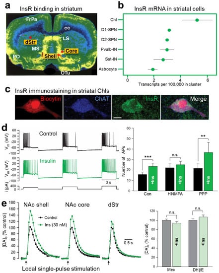 InsR localization in striatum and insulin-dependent regulation of striatal dopamine release via ChIs, InsRs and nAChRs. (a) Autoradiographic image of insulin receptor (InsR) binding sites throughout the rat striatum, including in the dorsal striatum (dStr), nucleus accumbens (NAc) core and shell subregions marked by red asterisks; modified with permission from [16]. Abbreviations: cc, corpus callosum; FrPa, frontal parietal cortex; LS, lateral septum; MS, medial septum; PO, preoptic area; oTu, olfactory tubercle. (b) Comparison of relative mRNA levels for InsRs in striatal cells shows high abundance in cholinergic interneurons (ChIs) versus D1 or D2 spiny projection neurons (SPNs), parvalbumin positive interneurons (Pvalb-IN), somatostatin positive interneurons (Sst-IN) or astrocytes; RNA-seq data was obtained using DropViz. (c) Immunohistochemical staining of InsRs in a biocytin-filled, ChAT-positive ChI; scale = 10 μm; images from [19]. (d) Left: Response of current-clamped rat ChI to depolarizing current pulses; insulin (30 nM) increases ChI excitability by attenuating action potential (AP) accommodation. Right: Insulin-induced increase in ChI excitability is prevented by an InsR antagonist, HNMPA, but not by an IGF-1R antagonist, PPP; from [19]. (e) Left: Insulin (30 nM) enhances single-pulse evoked increases in extracellular dopamine concentration ([DA]o) in dStr but has a greater effect in NAc core and NAc shell subregions of rat striatal slices. Right: Insulin evoked increases in [DA]o are prevented by nAChR antagonists, mecamylamine (mec) or DHβE; from [19]. For d and e, n.s. is not significant, ** p < 0.01, *** p < 0.001.
