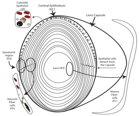A long-studied model for identifying mechanisms controlling organ development and cellular differentiation is the ocular lens that functions to focus light on the retina. Key to its utility for revealing novel mechanisms of development and differentiation, the lens is composed of two cell types including a single layer of undifferentiated cuboidal epithelial cells that overlay a core of elongated terminally differentiated fiber cells (Figure 1). During embryogenesis and throughout life, lens epithelial cells continuously differentiate into lens fiber cells through a tightly regulated differentiation program [1,2,3,4]. Lens cell differentiation is initiated in the germinal zone of the lens (Figure 1) where quiescent epithelial cells irreversibly withdrawal from the cell cycle [3,5]. Following cell cycle exit, nascent fiber cells then undergo a series of terminal remodeling and maturation steps including cellular elongation (Figure 1), expression of highly abundant fiber cell proteins, and the hallmark elimination of cellular organelles to achieve mature lens structure and transparency. These fully mature fiber cells constitute the core of the lens in a region of the lens called the organelle-free zone (OFZ) (Figure 1). Failure of lens epithelial cells to differentiate into fiber cells results in major lens structural defects and loss of transparency [6].