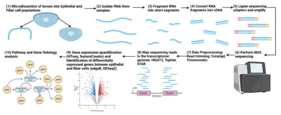 Workflow for an RNA-seq experiment comparing lens epithelial cells and fiber cells. The figure illustrates the sequential steps involved in the RNA-seq experiment, beginning with the isolation of lens epithelial and fiber cells, followed by RNA extraction, library preparation, sequencing, data preprocessing, differential gene expression analysis, and downstream functional enrichment analyses to identify the molecular mechanisms controlling lens differentiation. Adapted from “RNA Sequencing” by BioRender.com (2023). Retrieved from https://app.biorender.com/biorender-templates.