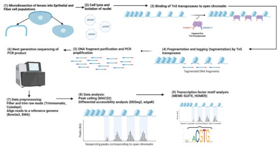 Assay for transposase-accessible chromatin using sequencing (ATAC-seq) has been used to study the chromatin accessibility changes during lens differentiation [101,103,133]. It involves the use of Tn5 transposase to insert sequencing adapters into open chromatin regions, which are subsequently sequenced to determine the location of the transposase insertion sites [134,135] (Figure 3). This technique has several advantages over traditional methods of chromatin accessibility profiling, such as DNase I hypersensitivity analysis [136,137] and FAIRE-seq (formaldehyde-assisted isolation of regulatory elements with sequencing) [138,139], including its high sensitivity, low input requirement, and fast turnaround time. By profiling the open chromatin landscape of undifferentiated lens epithelial cells and terminally differentiated lens fiber cells, researchers have identified key regulatory elements and transcription factors involved in lens differentiation.