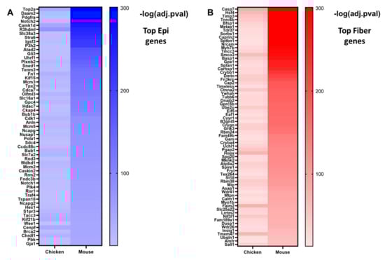 The top differentially expressed genes in mouse and chicken lens differentiation. Genes were classified as either epithelial cell genes (log2FC < 0, q < 0.05) or fiber cell genes (log2FC > 0, q < 0.05) and then ranked from lowest to highest q-value. (A) A heatmap showing genes in the top 200 epithelial cell genes in both E13 chicken and E16.5 mouse lenses. (B) A heatmap showing genes in the top 200 fiber cell genes in both E13 chicken and E16.5 mouse lenses. Darker colors represent smaller q-values.