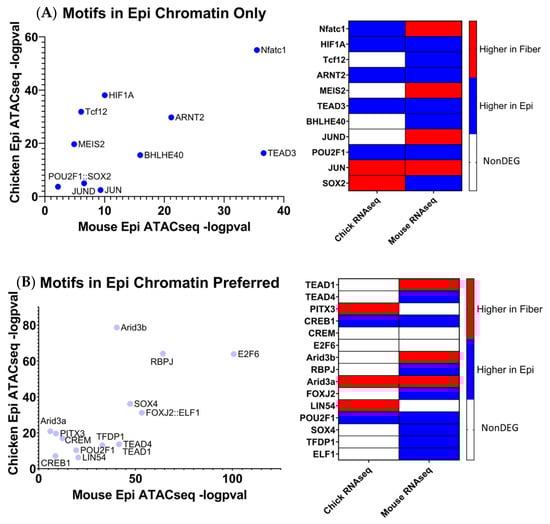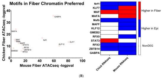 The human genome encodes approximately 1600 DNA-binding transcription factors [174]. Given the structural similarities between their DNA-binding domains, many factors such as those with homeodomains, basic helix–loop helix, and leucine zipper DNA-binding domains recognize similar DNA motifs [175,176], and adjacent binding of two factors occurs at “suboptimal” individual sites [177]. Importantly, there is remarkable conservation of their DNA-binding specificities across 600 million years of animal evolution [178]. A nice example is the regulation of chicken δ1-crystallin gene expression by synergistic Sox2 and Pax6 binding to “suboptimal” individual sites within the 3’-located lens-specific enhancer [96]. Therefore, after individual motifs have been identified, the next step is to examine families of transcription factors and prioritizing these factors with high levels of expression in individual tissues. Our present analysis found that 20 transcription factor motifs were enriched in open chromatin regions near evolutionarily conserved fiber cell genes in chicken and mouse lenses and simultaneously not enriched in open chromatin regions near epithelial cell genes, termed “Motifs in Fiber only” (Figure 10A). An additional 13 transcription factor motifs were found to be significantly more enriched in open chromatin regions near evolutionarily conserved fiber cell genes in chicken and mouse lenses as compared to epithelial cell genes, termed “Motifs in Fiber Chromatin Preferred” (Figure 10B).