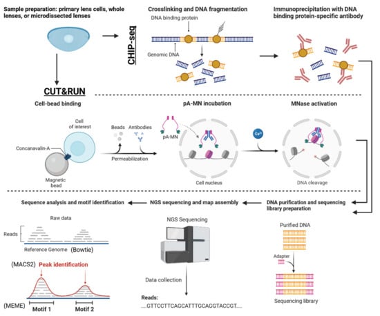 Workflow for a CUT&RUN/ChIP-seq experiment aiming to validate the genome-wide binding sites of a transcription factor previously identified as a candidate from a multiomics analysis. The figure depicts the parallel procedures for both CUT&RUN and ChIP-seq, including sample preparation, immunoprecipitation, library preparation, and sequencing. The resulting data were analyzed to identify transcription factor binding sites across the genome, providing experimental validation for the candidate transcription factor’s role in lens cell differentiation. This figure emphasizes the importance of employing complementary techniques to confirm the biological significance of findings derived from multiomics analyses. Adapted from “CUT&RUN Procedure”, by BioRender.com (2023). Retrieved from https://app.biorender.com/biorender-templates.