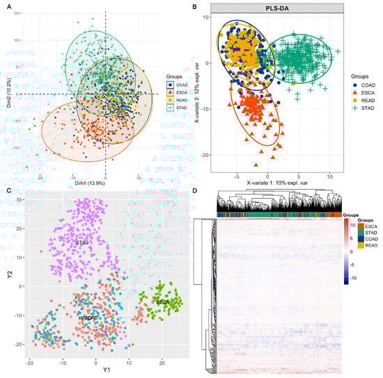 Overview of RPPA functional proteome profiling across ESCA, STAD, COAD, and READ tumour samples: (A) PCA plot, (B) PLS-DA plot, (C) t-SNE, and (D) heatmap showing clusters of tumour samples in ESCA, STAD, COAD, and READ based on all 217 protein profiles.