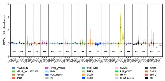 RPPA relative abundances of the 20 selected protein signatures in ESCA, STAD, and CRC samples. Each violin plot shows the minimum, median, and maximum protein abundance in one tumour type. *** p < 0.0001 by ANOVA.