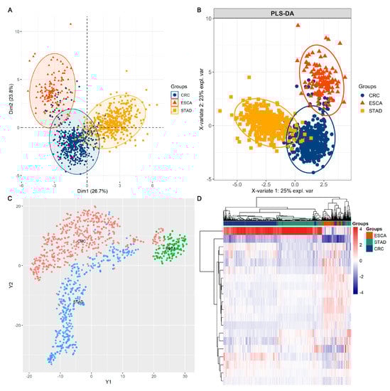 Clusters of tumour samples across ESCA, STAD, and CRC based on the 20 selected protein signatures: (A) PCA plot, (B) PLS-DA plot, (C) t-SNE, and (D) heatmap showing clusters of tumour samples in ESCA, STAD, and CRC.