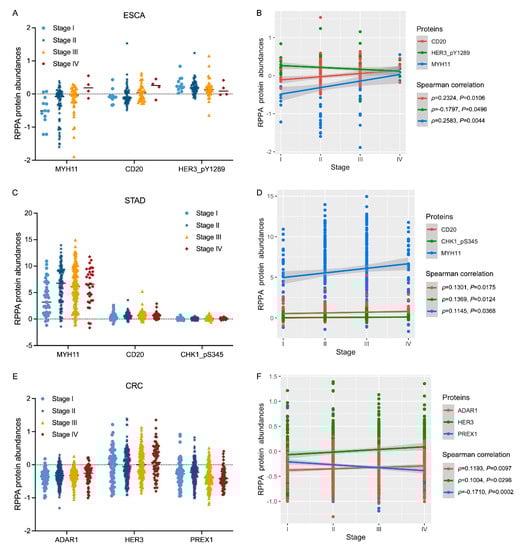 Associations of protein biomarkers with tumour stage: (A) scatter plot of proteins MYH11, CD20, and HER_pY1289 in stages I/II/III/IV of ESCA tumours; (B) Spearman correlation analysis of proteins MYH11, CD20, and HER_pY1289 with tumour stage in ESCA; (C) scatter plot of proteins MYH11, CD20, and CHK1_pS345 in stages I/II/III/IV of STAD tumours; (D) Spearman correlation analysis of proteins MYH11, CD20, and CHK1_pS345 with tumour stage in STAD; (E) scatter plot of proteins ADAR1, HER3, and PREX1 in stages I/II/III/IV of CRC tumours; (F) Spearman correlation analysis of proteins ADAR1, HER3, and PREX1 with tumour stage in CRC.