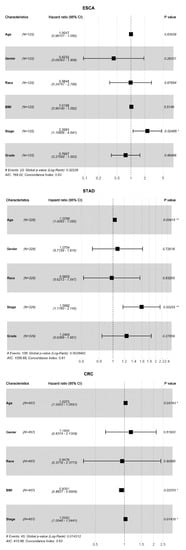 Forest plots of univariate Cox regression analysis in ESCA, STAD, and CRC tumours based on the corresponding clinical parameters. BMI: Body mass index. * p < 0.05, ** p < 0.01.
