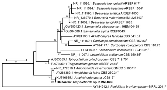 ML tree based on ITS gene sequences showing phylogenetic position of the strain KMM 4639 within family Cordycipitaceae. Bootstrap values (%) of 1000 replications. Nodes with confidence values greater than 50% are indicated. The scale bars represent 0.1 substitutions per site. T—ex-type strain.