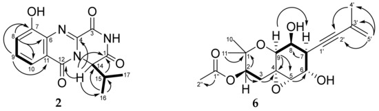 Key COSY (bold lines) and HMBC (arrows) correlations of 2 and 6.