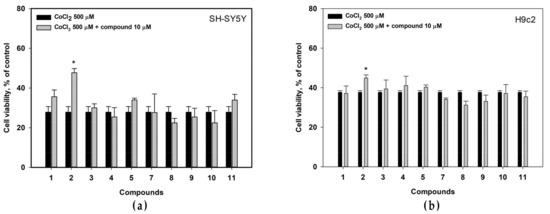Influence of the compounds on viability of CoCl2-treated (a) SH-SY5Y and (b) H9c2 cells. The viability of nontreated (control) cells were 100.3 ± 1.2%. All experiments were carried out in three independent replicates and the data are presented as a mean ± SEM. * indicated the statistically significant differences (p < 0.05).
