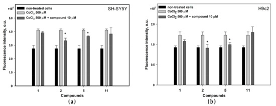 Influence of the compounds on ROS level in CoCl2-treated (a) SH-SY5Y and (b) H9c2 cells. All experiments were carried out in three independent replicates and the data are presented as a mean ± SEM. * indicated the statistically significant differences (p < 0.05).