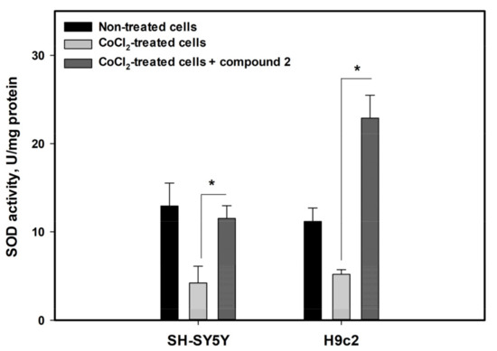 In addition, the effect of felicarnezoline B (2) on the activity of the superoxide dismutase (SOD) antioxidant enzyme was investigated to verify its influence on the intracellular antioxidant system in CoCl2-treated cells (Figure 8).