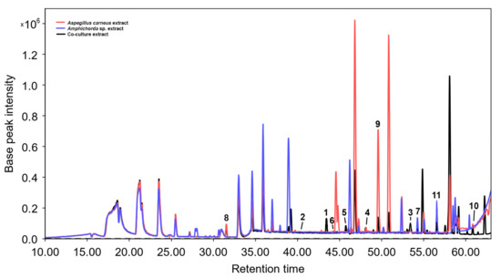 HPLC MS chromatogram of extracts of Aspergillus carneus and Amphichorda sp. monocultures as well as their co-culture. The numbers correspond to the numbers of the isolated compounds.
