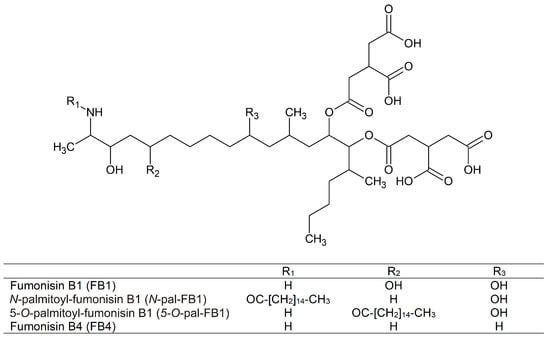 Chemical structures of fumonisin B1 (FB1), N-palmitoyl-fumonisin B1 (N-pal-FB1), 5-O-palmitoyl-fumonisin B1 (5-O-pal-FB1), and fumonisin B4 (FB4).