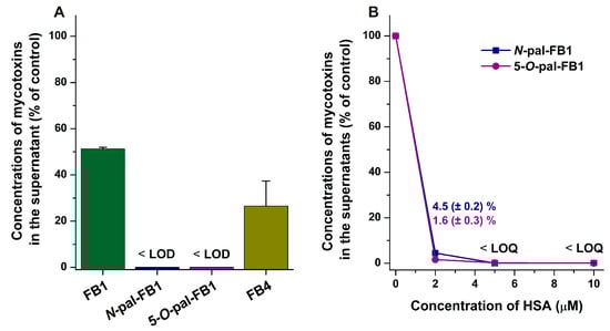 Considering the strong removal of palmitoyl-FB1 derivatives by HSA, we repeated these experiments with 2, 5, and 10 μM of HSA. Interestingly, even 2 μM of the protein led to remarkable decreases in the concentrations of N-pal-FB1 and 5-O-pal-FB1 in the supernatant (Figure 3B).