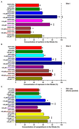 Effects of FB1, N-pal-FB1, 5-O-pal-FB1, palmitic acid, and FB4 on the concentrations (% ±SEM) of warfarin (WAR; (A)), naproxen (NAP; (B)), and S-camptothecin (CPT; (C)) in the filtrate (PBS; * p < 0.05, ** p < 0.01; see further experimental details in Section 2.4). In each model, 100% (see with black dashed line) was the level of the site marker in the filtrate when the site marker was filtered without the protein.