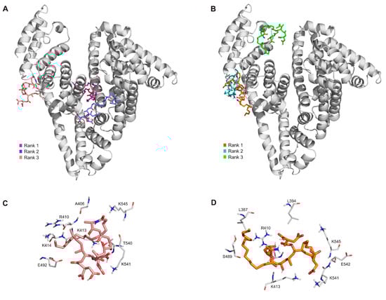 The first three ranked binding modes of N-pal-FB1 (A) and 5-O-pal-FB1 (B) on albumin (grey cartoon). The third ranked binding mode of N-pal-FB1 ((C), pink sticks) and the first ranked binding mode of 5-O-pal-FB1 ((D), orange sticks), where the interacting amino acids were marked with thick grey lines.