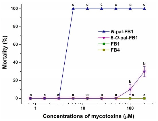 Mortality rates (% ± SEM) of zebrafish embryos at 120 hpf treated in an exposure window of 96–120 hpf with FB1, N-pal-FB1, 5-O-pal-FB1, and FB4. Statistical significance between treatment groups was established using two-way ANOVA with Tukey multiple comparisons tests (a, b, c: p < 0.0001).