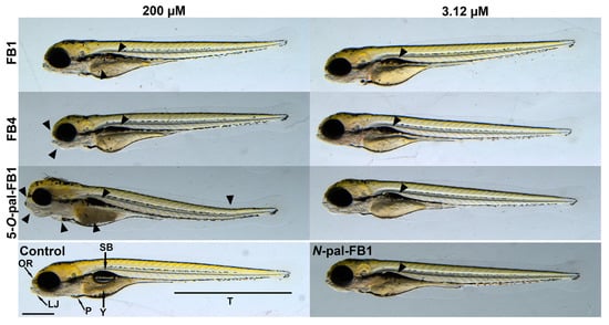 At 200 µM concentration, FB1, FB4, and 5-O-pal-FB1 caused uninflated swim bladder in most of the embryos (Table 1), where the highest abundance of this phenotype was induced by 5-O-pal-FB1 (100%). Abnormal yolk coloration (Figure 7) was observed after the treatment with 200 µM of FB1 (15%; not statistically significant), FB4 (40%), and 5-O-pal-FB1 (100%). FB1 did not cause head malformations (deformations of the lower jaw and the olfactory region; Figure 7), while these deformities occurred in zebrafish embryos exposed to 200 µM of FB4 (40%) and 5-O-pal-FB1 (100%). Curvature of the body axis (71%) and edemas (15%; not statistically significant) were induced only by 5-O-pal-FB1 treatment (200 µM; Figure 7 and Table 1).
