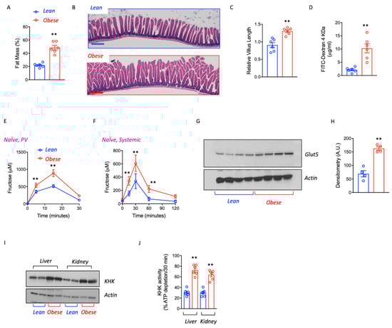 Fructose metabolism in the intestinal epithelium has been reported to efficiently increase villus length and expand the surface area of the gut [] while increasing intestinal permeability []. We, therefore, examined if fructose absorption and metabolism might be increased in obese mice compared to lean mice. We measured fructose levels and clearance in the portal vein and systemic circulation following a single fructose oral gavage (1.25 g/kg, corrected for lean body mass) in lean and obese mice never exposed to fructose before (naïve). As shown in Figure 1E,F, obesity was associated with greater intestinal fructose absorption at 10′ and 15′ post-fructose administration (2.3 ± 0.4x increase in portal vein fructose, p < 0.01) as well as with greater circulating levels of fructose associated with reduced clearance. Consistent with greater extra-splanchnic fructose availability, the expression of the main fructose transporter (Glut5) in the gut was significantly up-regulated in obese mice despite not being exposed to fructose before (Figure 1G,H). Similarly, the expression of ketohexokinase (KHK, also known as fructokinase), the first enzyme involved in fructose metabolism [,], was also significantly up-regulated in the liver and kidneys of obese mice (Figure 1G,H) compared to lean counterparts suggesting increased fructose processing in these organs.