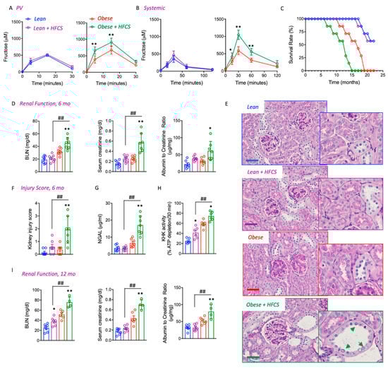 To determine whether higher fructose intestinal absorption rates and metabolism would be indicative of a much greater susceptibility of obese mice to the deleterious effects of sugar, we then analyzed the effect to long-term exposure to clinically relevant doses of a fructose–glucose beverage in lean and pound mice. To this end, a glucose–fructose (45/55 ratio) solution similar to high fructose corn syrup (HFCS) was provided in the drinking water of obese mice at a concentration (10%) similar to those found in soft drinks. As shown in Figure 2A,B, pre-administration of HFCS for 2 weeks further elevated portal vein and systemic levels of fructose following a fructose oral gavage compared to weight-matched naïve obese but not lean mice. We previously have demonstrated that obesity accelerates kidney disease in mice by causing metabolic dysregulation in the proximal tubule, which was associated with a significant reduction in the survival rate of obese pound mice with lifespans of less than 12 months [].