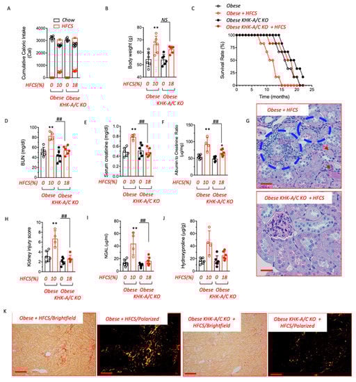 To determine the importance of fructose metabolism in sugar-induced kidney dysfunction in obese mice, we generated pound mice deficient for both main isoforms of KHK (KHK-A and KHK-C, namely KHK-A/C KO) and analyzed their response to HFCS. Baseline analysis between pound obese and obese-KHK-A/C KO mice revealed similar age-dependent weight gain (body weight at 8 months was 52.5 ± 2.7 g in obese-KHK-A/C KO vs. 55.3 ± 4.6 g in wild-type obese littermates) and adiposity (41.3 ± 4.1% fat mass in obese-KHK-A/C KO vs. 46.2 ± 2.8% in wild type obese littermates). However, consistent with previous reports in KHK-A/C KO mice [,], HFCS intake was significantly reduced in obese-KHK-A/C KO compared with wild-type obese counterparts (5.7 ± 1.2 mL/day in obese-KHK-A/C KO vs. 11.3 ± 2.6 mL/day in wild type obese littermates, p < 0.01). Based on this significant difference in HFCS intake, we administered 10% HFCS to obese mice and gave 18% HFCS solution to obese-KHK-A/C KO mice to provide equivalent HFCS, and we did this for 6 to 18 months. This way, we matched both sugar and caloric intake as well as fructose-derived calories (Figure 3A). No differences in weight were observed at 8 months of age between HFCS-exposed obese-KHK-A/C KO and wild-type obese counterparts (Figure 3B). However, despite similar adiposity between groups, the survival rate observed in pound mice on HFCS was significantly improved when KHK expression was deleted (10.5 ± 2.6 months in HFCS-exposed obese vs. 17.4 ± 1.2 in HFCS-exposed obese-KHK-A/C KO mice, Figure 3C), indicating that the specific blockade of fructose metabolism in mice improves the lifespan of obese mice in response to HFCS in the drinking water. Importantly, at 12 months of age, the increased survival rate in HFCS-exposed obese-KHK-A/C KO mice was associated with a marked improvement in kidney function as noted by lower plasma BUN (82.7 ± 8.1 mg/dL in HFCS-exposed obese vs. 54.3 ± 8.4 mg/dL in HFCS-exposed obese-KHK-A/C KO mice), creatinine (0.78 ± 0.05 mg/dL in HFCS-exposed obese vs. 0.47 ± 0.08 mg/dL in HFCS-exposed obese-KHK-A/C KO mice), and albuminuria (92 ± 19.8 μg/mg in HFCS-exposed obese vs. 66.3 ± 9.5 μg/mg in HFCS-exposed obese-KHK-A/C KO mice) (Figure 3D–F), less histologic injury (Figure 3G,H and Table 1), and lower urinary NGAL levels (43.9 ± 18.1 μg/mL in HFCS-exposed obese vs. 16.3 ± 6.7 μg/mL in HFCS-exposed obese-KHK-A/C KO mice, Figure 3I). Injury scoring in this study is described in detail in Table 1. Specifically, chronic exposure of obese mice to HFCS demonstrated particular pathological features in the renal corpuscle (hypercellularity, protein casts in glomeruli, thickened basal membrane), cortex (tubular casts, glycogenated nuclei, peritubular and peri arcuate inflammation, and pigmented macrophages), medulla (cast and inflammation) as well as inflammation in peri-interlobar artery. Furthermore, kidney fibrosis, as denoted by both cortical levels of hydroxyproline and tubulointerstitial collagen staining with picrosirius red, was also significantly higher in obese mice on HFCS compared to obese-KHK-A/C KO mice receiving the same amount of HFCS (Figure 3J,K).
