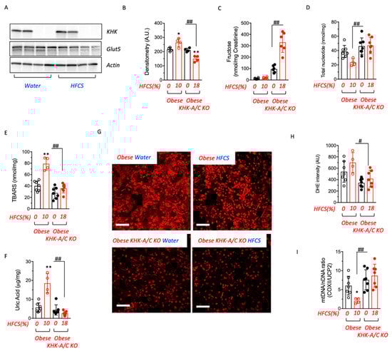 Circulating fructose is filtered by kidney glomeruli and reabsorbed from the lumen in the proximal tubule by the fructose transporter Glut5 (SLC2a5), where it is then metabolized via KHK in the proximal tubule [,]. Much of the kidney injury in response to fructose results from the proximal tubule metabolism associated with oxidative stress and inflammation []. We found that renal Glut5 expression was significantly reduced in obese-KHK-A/C KO mice on water or exposed to HFCS compared to obese littermates (44.3 ± 5.3% reduction in HFCS-exposed obese-KHK-A/C KO mice compared to HFCS-exposed obese mice, p < 0.01, Figure 4A,B) indicating that renal fructose metabolism is necessary for Glut5 expression and fructose uptake in the kidney. Consistent with this finding, urinary fructose excretion was elevated in obese-KHK-A/C KO mice (17.8 ± 7.4 nmol/mg in HFCS-exposed obese vs. 330.8 ± 88.8 nmol/mg in HFCS-exposed obese KHK-A/C KO mice, p < 0.01) (Figure 4C), and this was associated with less metabolic dysfunction in the kidneys compared to obese controls receiving HFCS (Figure 4D–I). Of interest, the loss of fructose in the urine in obese KHK-A/C KO mice was similar to that of lean KHK-A/C KO counterparts receiving consuming similar amounts of HFCS (286.8 ± 76.8 nmol/mg). While kidneys of HFCS-exposed obese mice had significantly reduced energy charge (total nucleotide levels, Figure 4D) and higher oxidative stress as noted by higher levels of thiobarbituric reactive substances (TBARS) and uric acid (Figure 4E,F), it was significantly less in obese-KHK-A/C KO receiving HFCS. Similarly, higher mitochondrial oxidative stress (noted by elevated mitochondrial superoxide production detected with dihydroethidium) (Figure 4G,H) and lower proximal tubule mitochondrial number (Figure 4I) were present in obese mice receiving HFCS, while the obese-KHK-A/C KO receiving HFCS were protected.