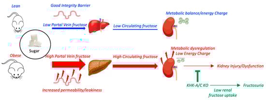 The proposed mechanism whereby sugar exacerbates renal disease in obese mice. Obesity is associated with intestinal dysfunction and increased permeability/leakiness. In these conditions, for the same exposure to sugar, portal veins and systemic levels of fructose are markedly elevated in obese mice in association with higher fructokinase (KHK) expression in the liver and kidney. Furthermore, renal energy charge and mitochondrial function in obese mice are reduced compared to lean counterparts, and therefore, higher fructose delivery and metabolism in the kidney lead to greater metabolic dysfunction, oxidative stress, and inflammation. This effect induced by dietary liquid sugar is markedly ameliorated when renal fructose metabolism is deleted as it impairs glut5-dependent fructose uptake and reabsorption causing fructosuria.