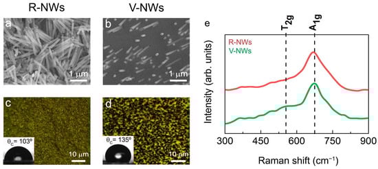 SEM images of electrodeposited iron (a) random NWs (R-NWs) and (b) vertical NWs (V-NWs). Optical images and contact angles of (c) R-NWs and (d) V-NWs orientations. (e) Raman spectra from 300 cm−1 to 900 cm−1 for R-NWs and V-NWs substrates. The positions for the active vibrational modes of magnetite are marked with vertical black lines. In-plane Raman intensity images measuring different single Raman spectra were taken at 100 nm with a laser excitation power of 0.25 mW for R-NWs (red) and V-NWs substrates (green).