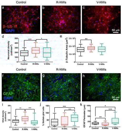 Hippocampal cell densities by NWs orientation. Immunofluorescence micrographs visualizing neurons (a–c), red anti-β-tub III and glial cells (f–h), and green anti-GFAP in three different conditions. Nuclei are visualized by DAPI (in blue). Scale bars: 50 μm. Box plot (d) summarizes neuronal densities of the control (n = 59 visual fields, 8 samples, n = 3 series of cultures), R-NWs (n = 62 visual fields, 7 samples, n = 3 series of cultures), and V-NWs substrates (n = 59 visual fields, 8 samples, n = 3 series of cultures) and (e) β-tub III areas of the control (n = 65 visual fields, 8 samples), R-NWs (n = 69, 7 samples), and V-NWs substrates (n = 68, 8 samples). Box plot (i) summarizes the glial densities in the control (n = 45, 6 samples), R-NWs (n = 46, 5 samples), and V-NWs substrates (n = 46, 6 samples). (j) The percentage of stellate glial cells in the control (n = 43, 6 samples), R-NWs (n = 44, 5 samples), and V-NWs substrates (n = 43, 6 samples). (k) The GFAP perimeter for the substrates tested in the control (n = 51, 6 samples), R-NWs (n = 50, 5 samples), and V-NWs substrates (n = 44, 6 samples). p values: * p < 0.05, ** p < 0.01, and *** p < 0.001.